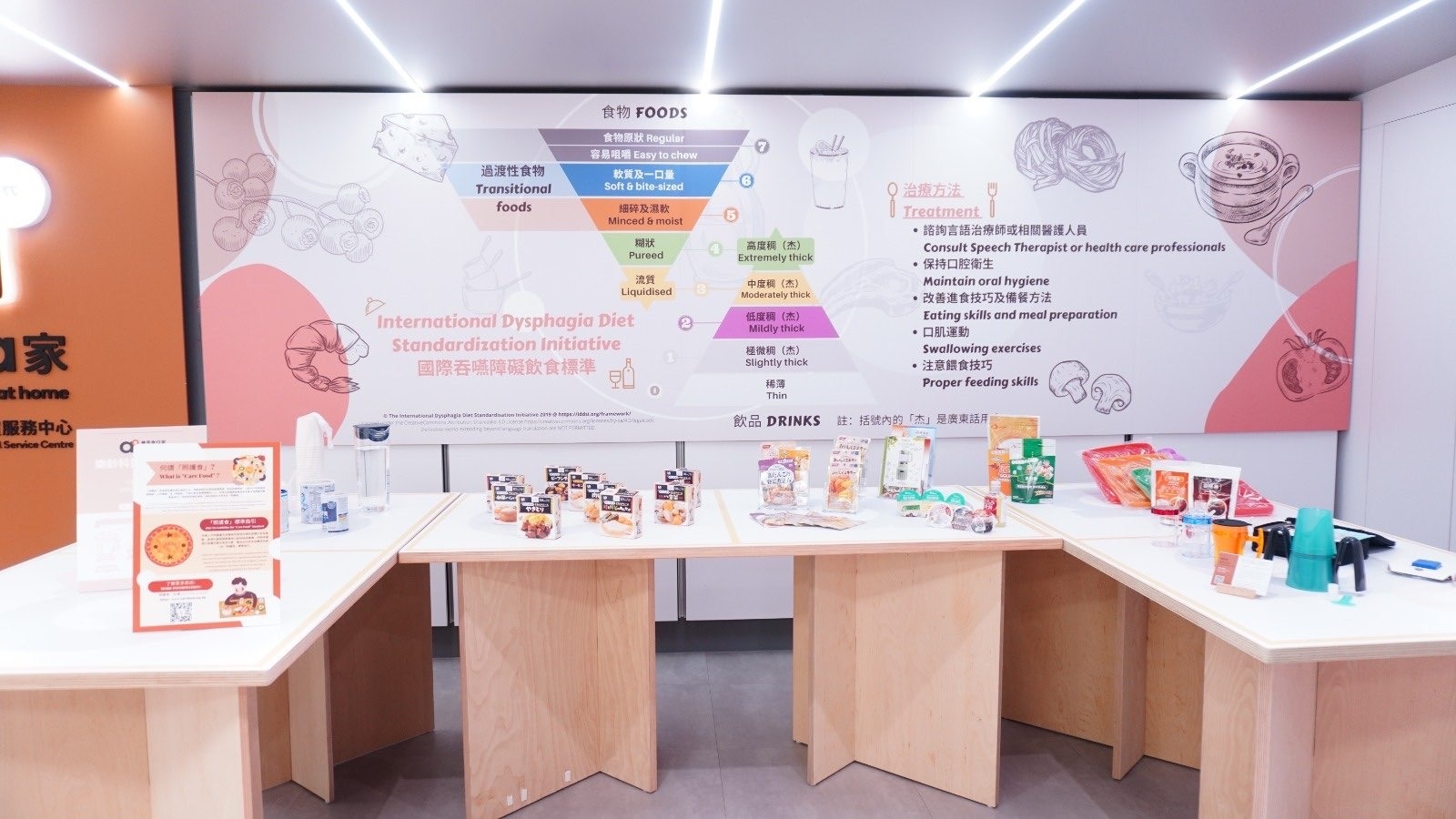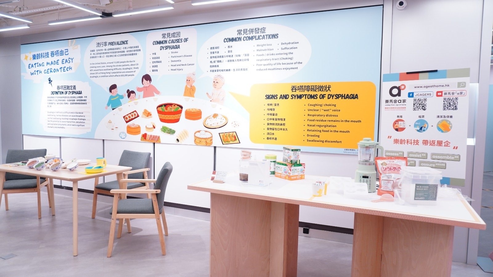 展覽以顯淺方式從醫學角度解說何謂吞嚥困難,並介紹適合吞嚥困難人士享用的「照護食」;同時展出多種可助吞嚥和支援餵食的樂齡科技。賽馬會「a家」並與多個機構合辦互動體驗工作坊,讓大家親身學習。中心更設有簡單吞嚥風險評估,為有需要人士測試,從而及早得到合適的支援。