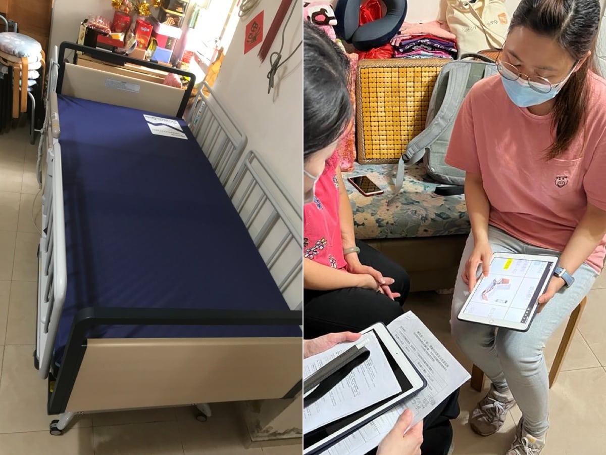 由於媽媽是「長者社區照顧服務券」(社區券)的持有人,在竹園區神召會鳳德護老健康中心轉介下,我們認識到賽馬會「a家」的「a家陪你試-借用輔助科技產品試驗計劃」,知道計劃可以讓社區券持有人免費試用及體驗輔助器材8個星期,因此我們決定參加計劃,並為媽媽借用適合的輔助器材,看看能否幫助她解決生活起居的困難及減輕我們的照顧壓力。原來賽馬會「a家」不單止提供器材租賃服務,還提供全面的評估。在借用器材前,他們先安排職業治療師和社工上門評估,了解媽媽的身體及認知狀況、我們的實際需要及評估家居環境,再建議我們借用醫療護理超低床和有輪沐浴便椅。同時,治療師很耐心地教授我們照顧和轉移技巧,亦細心聆聽我們的意見,護理床可安裝在客廳,讓媽媽可以舒適地看電視,以及和我們互動;而有輪沐浴便椅則方便我和工人姐姐推媽媽出入洗手間,令媽媽洗澡和如廁變得更加方便和安全。