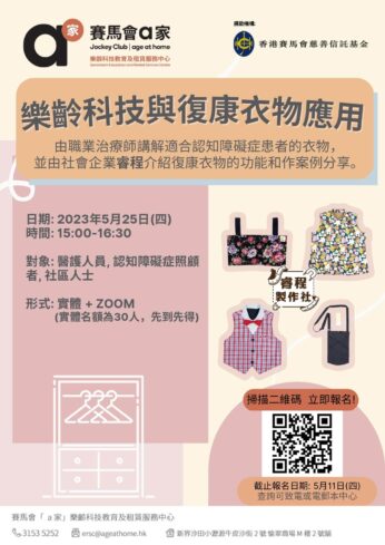 為此,我們將舉辦「樂齡科技與復康衣物應用」工作坊,由職業治療師講解適合認知障礙症患者的⾐物,並由社會企業睿程介紹復康⾐物的功能和作案例分享。