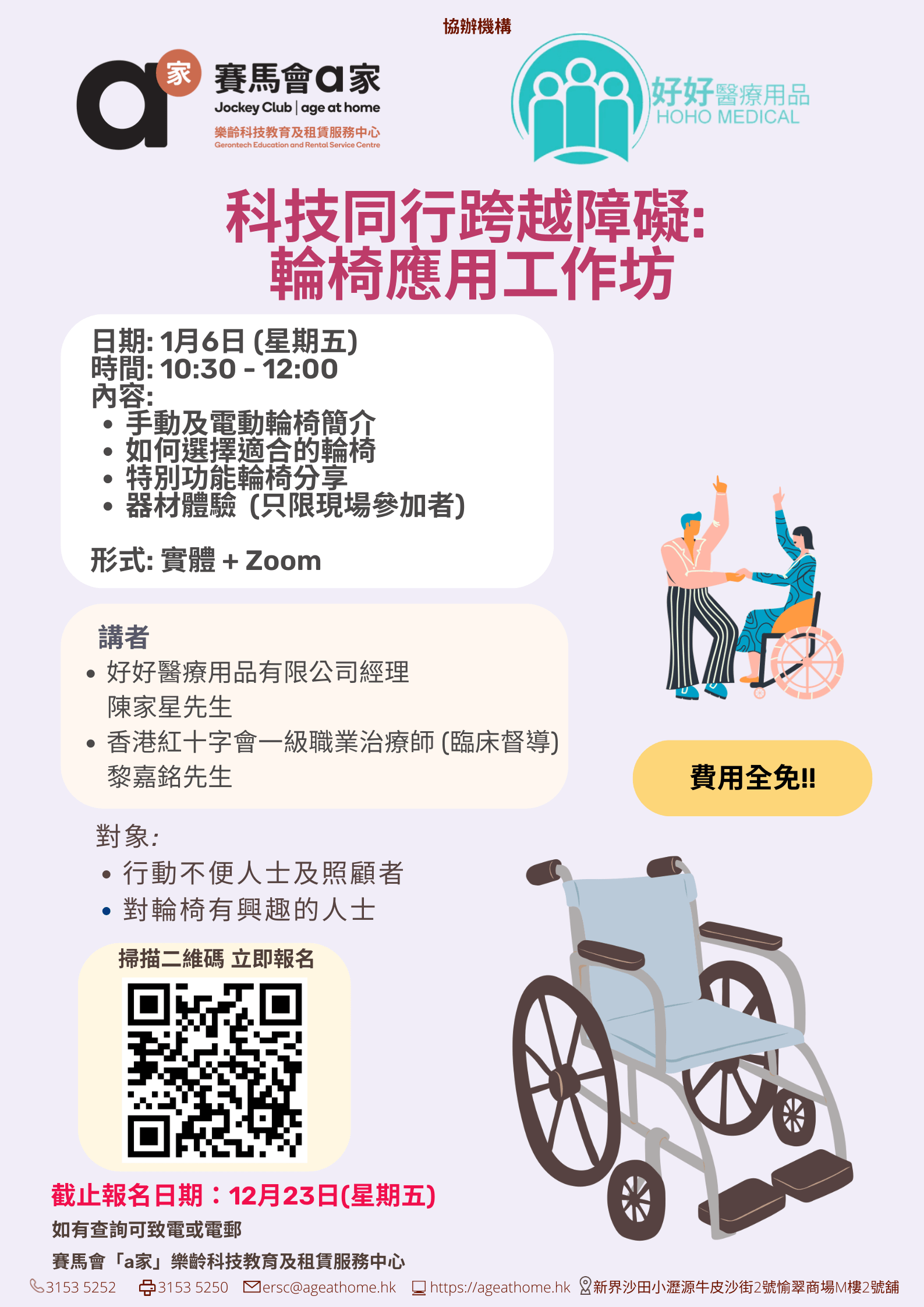 最後一場工作坊將會是「科技同行跨越障礙: 輪椅應用」工作坊, 為大家講解不同手動及電動輪椅之功能、如何選擇適合的輪椅及分享有着特別功能的輪椅, 現場參加者亦可體驗使用器材。