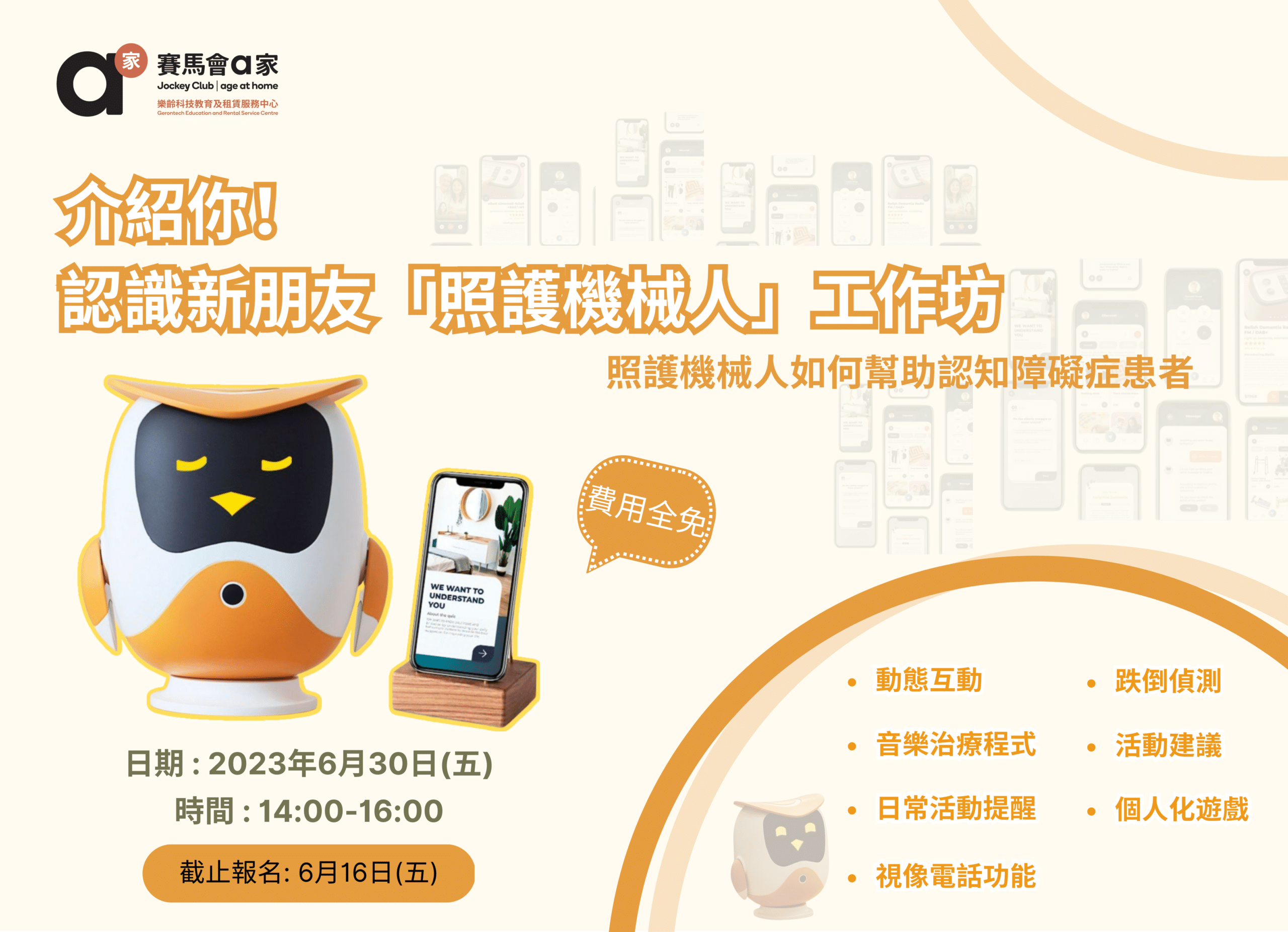 下個工作坊將會是「認識新朋友『照護機械人』」工作坊,由職業治療師與香港理工大學設計學院團隊講解以及分享照護機械人如何幫助認知障礙症患者。