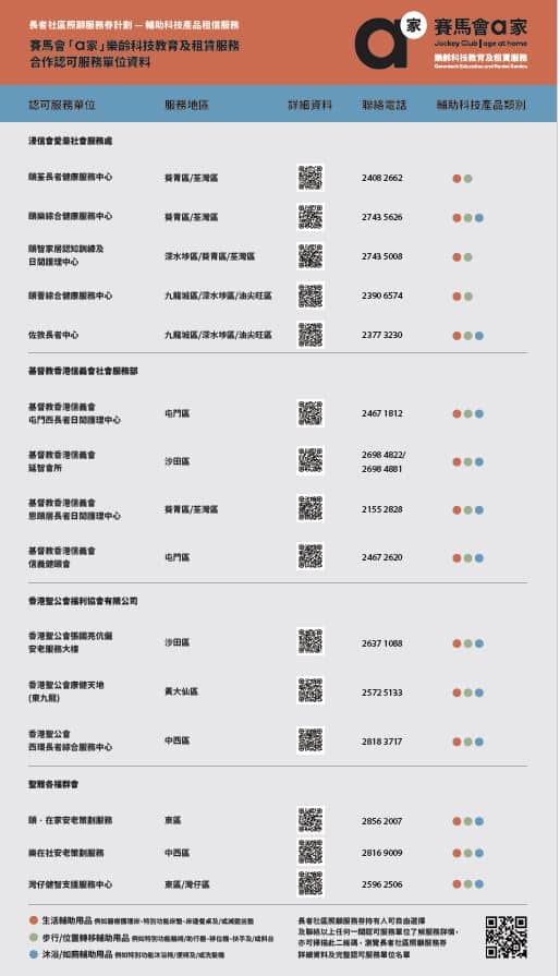 長者社區照顧服務券計劃 — 輔助科技產品租借服務 合作認可服務單位資料